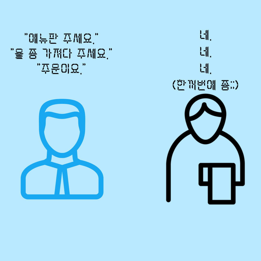 위의 그림처럼 클라이언트는 사진을 달라, 영상을 달라 등과 같은 지속적인 요청을 하고, 서버는 이에 대한 응답을 하게 됩니다. 식당으로 비유하면 손님이 종업원에게 이렇게 말합니다.